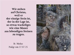 Seite an Seite mit dem Hohlblockstein Predigt Br. Markus vom 27.07.2025 zu 1. Petrus 2, 2-10 Weiter lesen » 28. Juli 2025